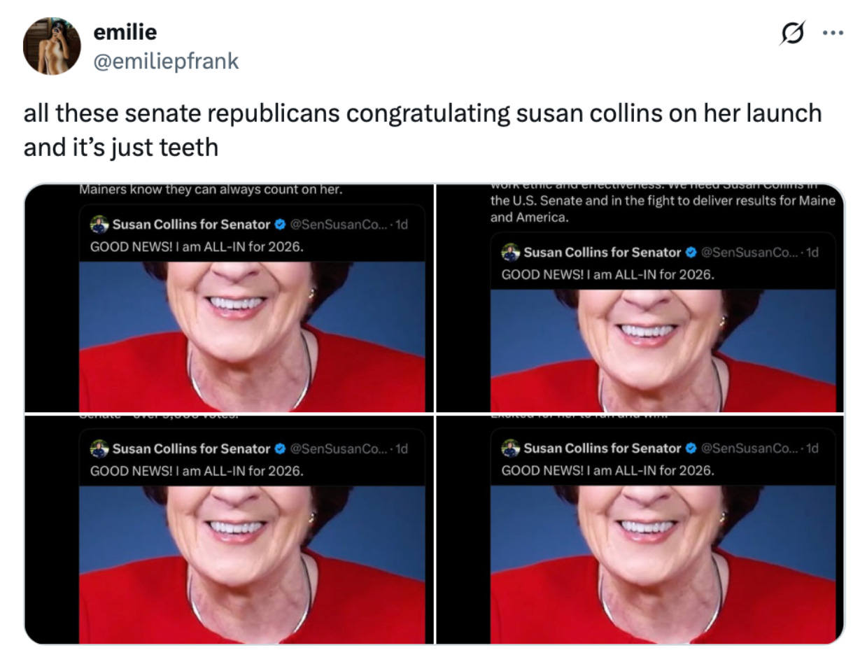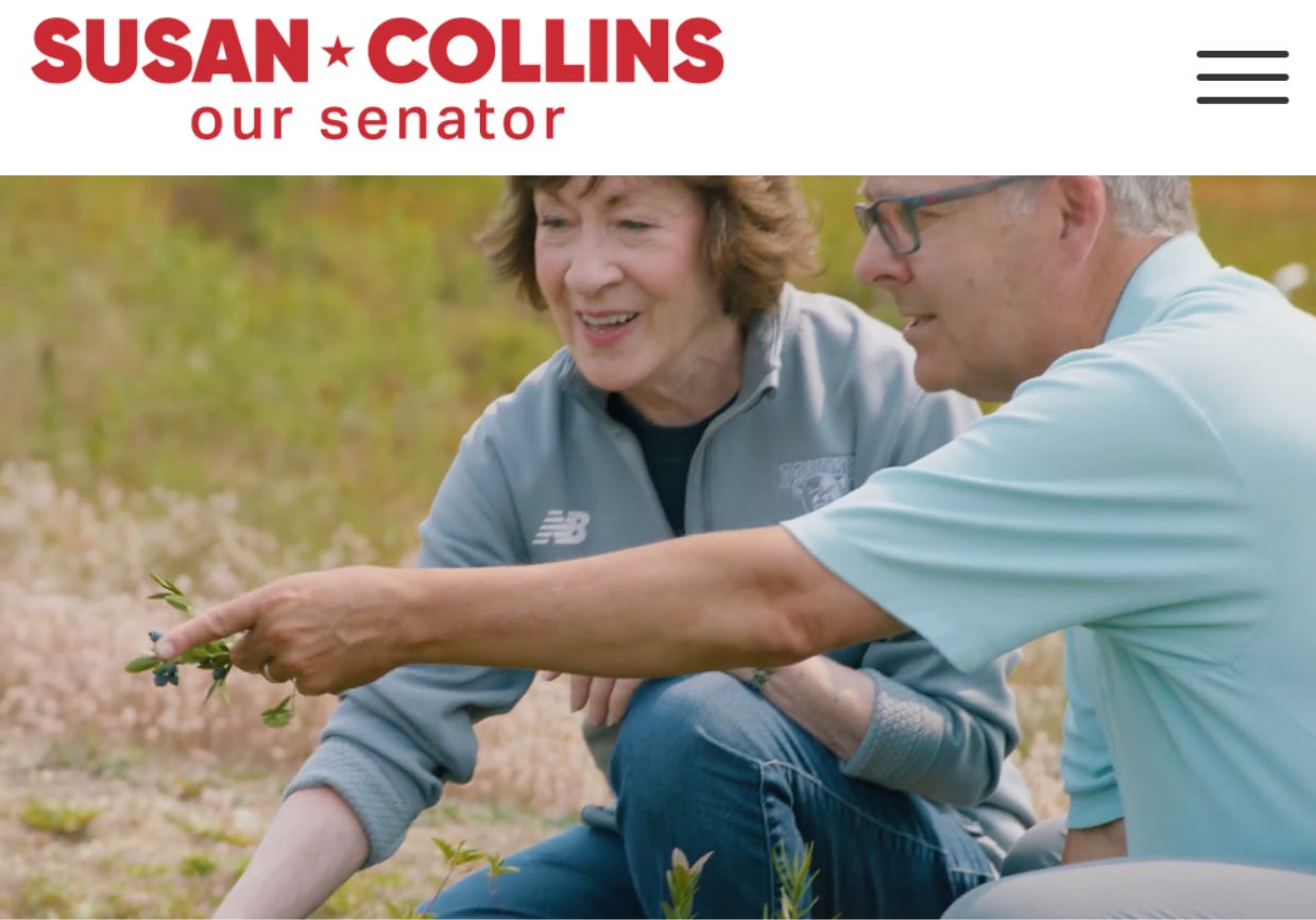 The Collins campaign website has been updated with a new “Track Record” tab. At the top of the page are jobs and workforce development, healthcare, Alzheimer’s, Diabetes, and Social Security, giving some insight into the mean age of her supporters and the parts of her record she’ll likely promote in the race. Her New Balance unboxing video was published to coincide with an editorial on why she’s running in the Bangor Daily News, and she posted another video of Mainers saying why they support her.