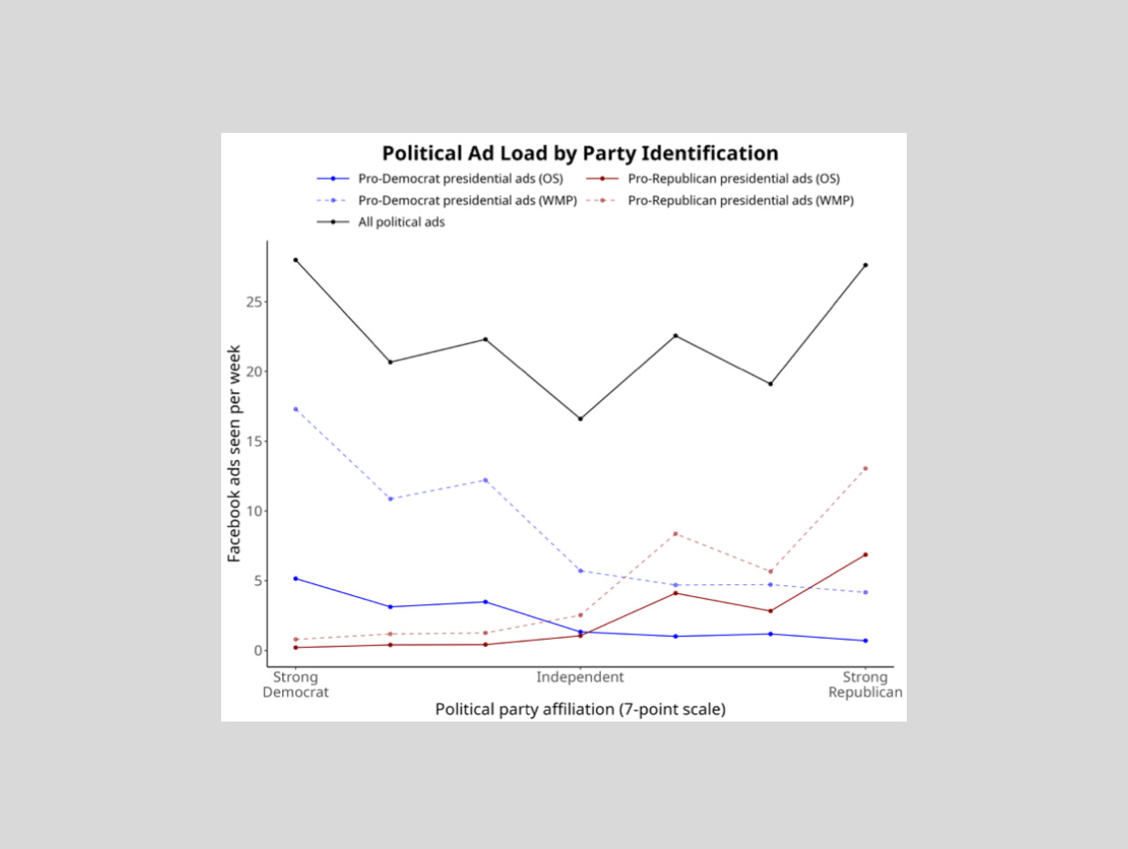 The study found something surprising: removing political ads from users’ feeds had no detectable effect on the tested outcomes like turnout, donations, political knowledge, candidate favorability, or polarization. If a feed without political ads doesn’t change behavior, though, it might have something to do with the fact that those who see them the most are among the most partisan and politically engaged already.