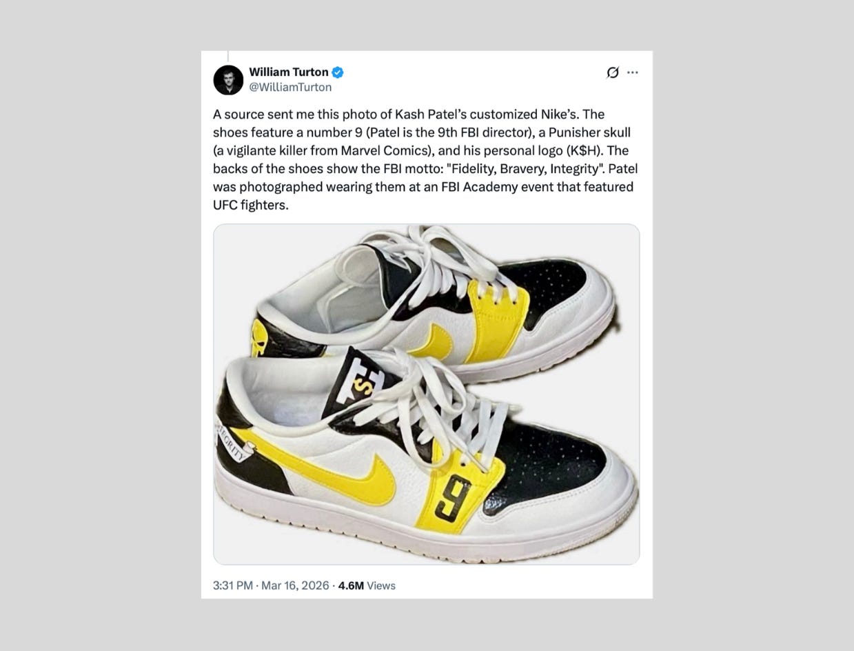 When FBI Director Kash Patel arrived at a joint training session with the mixed martial arts league UFC over the weekend at the FBI Academy in Virginia, he was wearing a custom pair of Nike sneakers that past directors wouldn’t have dared to step out in.