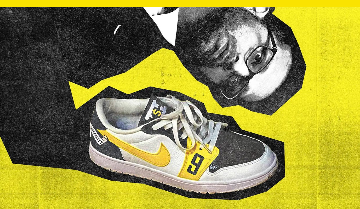 Patel’s bespoke shoes were black, white, and yellow, and featured a number 9 on the side to signify that he is the bureau’s ninth director. A “K$H” logo on the tongue is Patel’s personal logo (FBI directors have personal logos now), and a skull from the Marvel character Punisher appeared across the back of the shoe, along with the FBI’s slogan “Fidelity, Bravery, Integrity,” according to images that a source sent to William Turton, a reporter for ProPublica who covers federal law enforcement. However, Nike didn’t design or produce the customized embellishments, I can confirm.