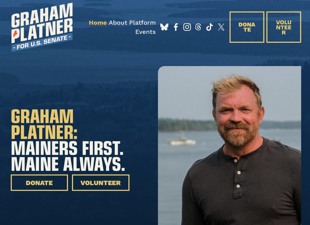 Platner’s “Democrat” logo isn’t his campaign’s main logo as seen on its website and social media assets. Instead, that logo is set on a progressive slant with a lockup that uses a map of Maine in the counter of the letter P in Platner’s name. It looks liberal, but there’s no outward declaration of party. His campaign’s digital graphics include the slogan “Mainers First. Maine Always.” that manages to localize and liberalize a Trumpism by putting people first.