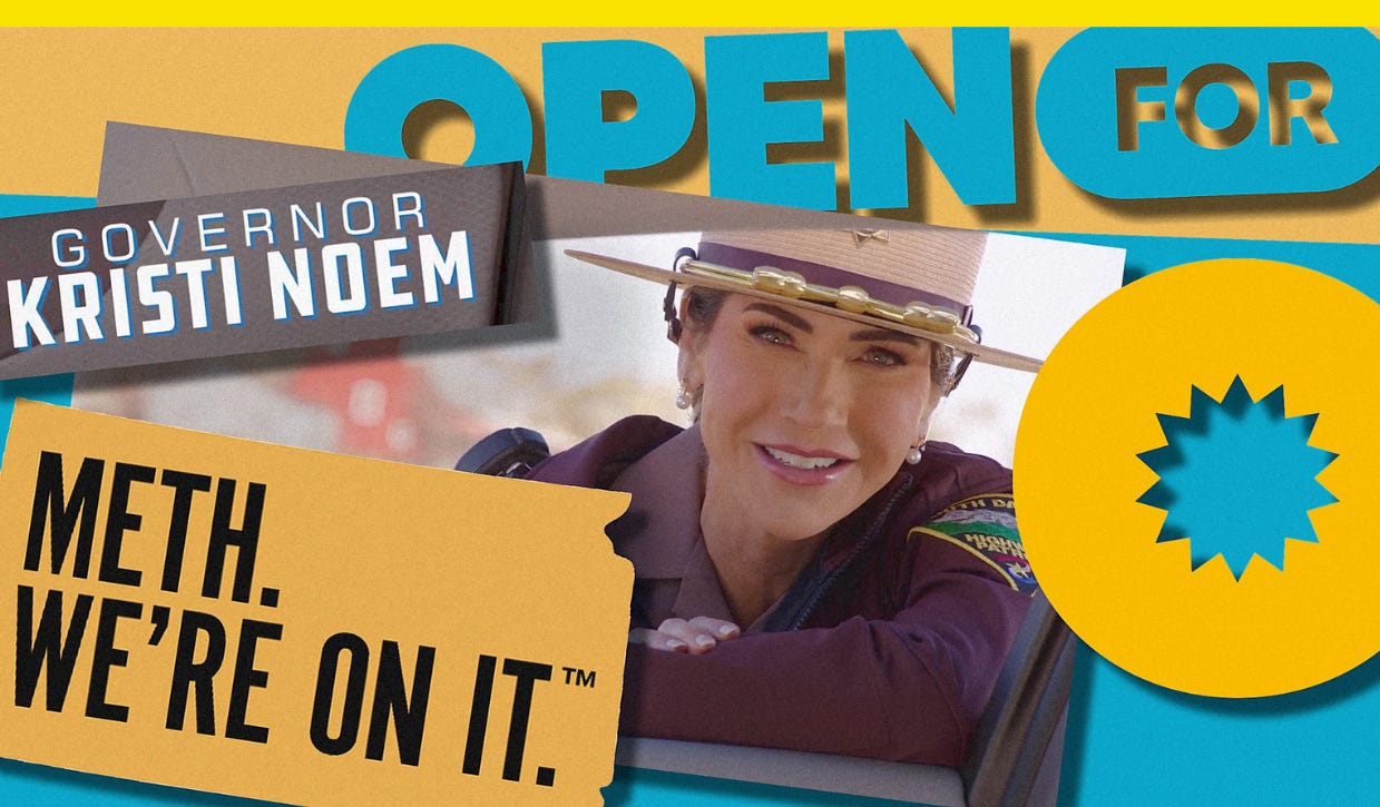 Homeland Security Secretary Noem has a history of weird PSAsNoem once defended her state’s “Meth. We’re On It.” campaign and starred in an ad last year praising Trump.Hunter SchwarzJan 29, 2026∙ PaidShareHello, from Yello, a newsletter about political aesthetics, persuasion, and design by Hunter Schwarz. Subscribe:SubscribeContinue reading this post for free, courtesy of Hunter Schwarz.Claim my free postOr purchase a paid subscription.