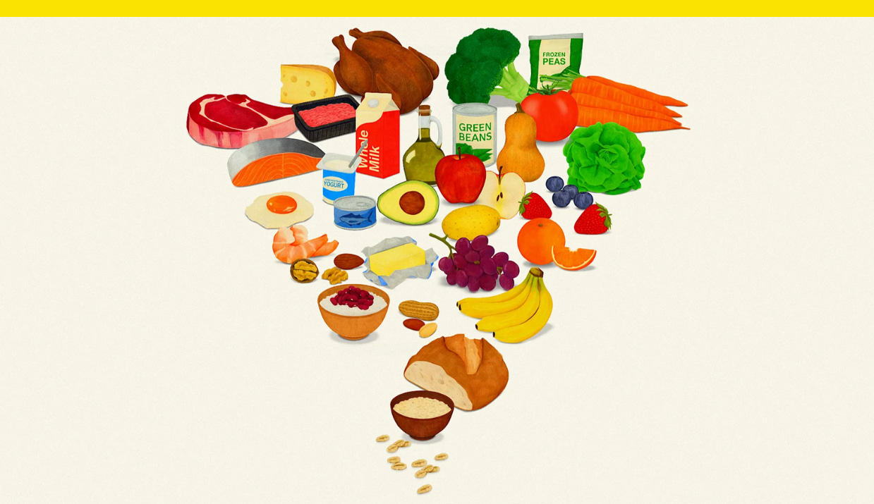The graphic is colorful, with eye-catching, painterly illustrations of example foods that might appear in a 1970s health food magazine. But the infographic is less successful as a piece of communication design. It’s not clear how literally the placement of foods within the graphic is meant to be. And although supporting documents about the new pyramid offer specific guidelines, like suggesting that saturated fat consumption should not exceed 10% of total daily calories, the new pyramid does not communicate specifics itself.