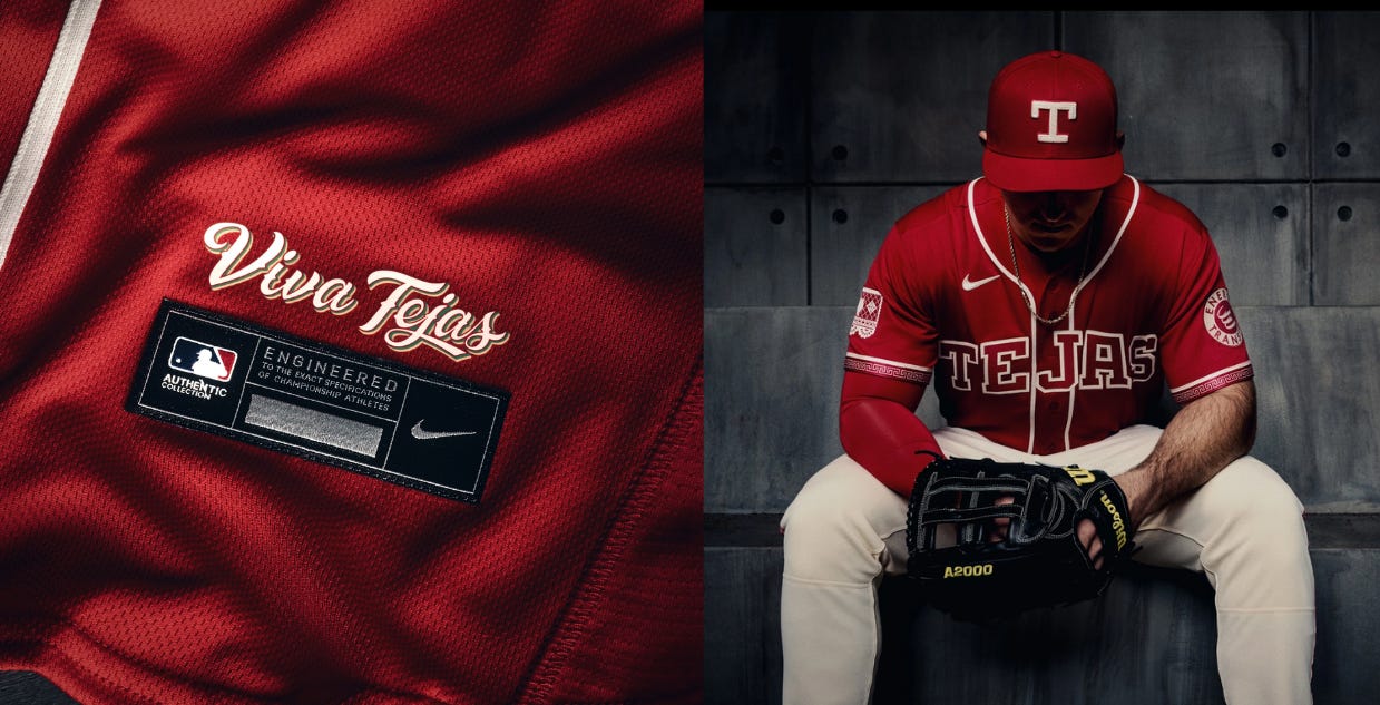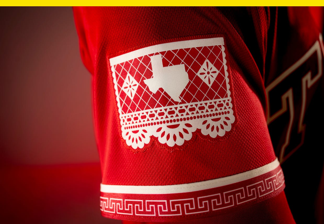 The new “Viva Tejas” uniforms, for “Long Live Texas,” uses the state’s Spanish-language name on the front, while the bright red color of the jersey was chosen to match the color of a crimson dye made from cochineal insects, the oldest pigment in the Americas. There’s a Charro-style pattern around the sleeve inspired by the embroidery used by Mexican horsemen, and on the left sleeve, there’s a Texas map decal designed in the style of Mexican papal picado, or tissue paper art.