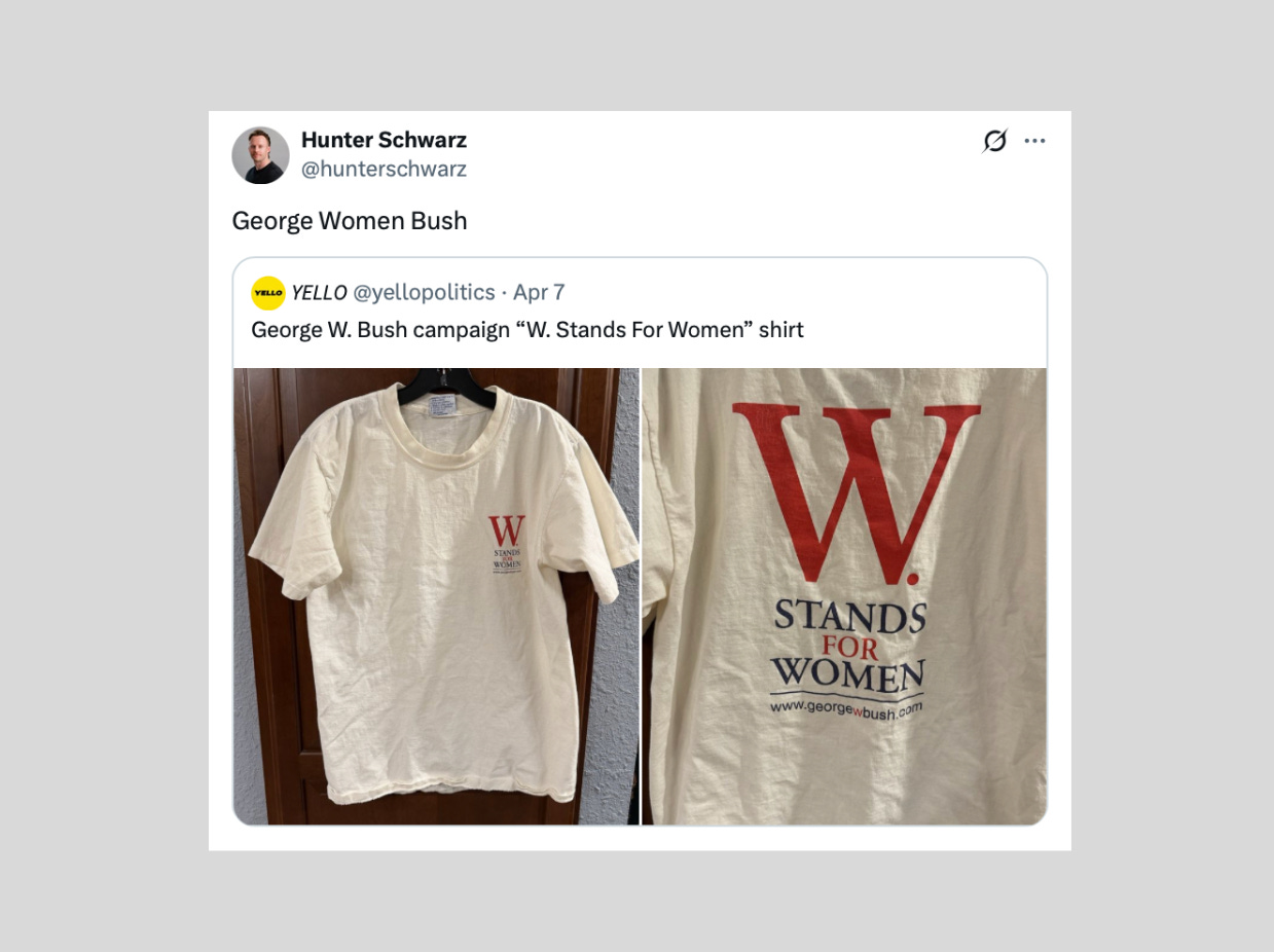 George W. Bush’s presidential campaigns used “W. Stands for Women” branding as part of its outreach to female voters. And his father was called George Herbert Women Bush. [hunterschwarz/X]