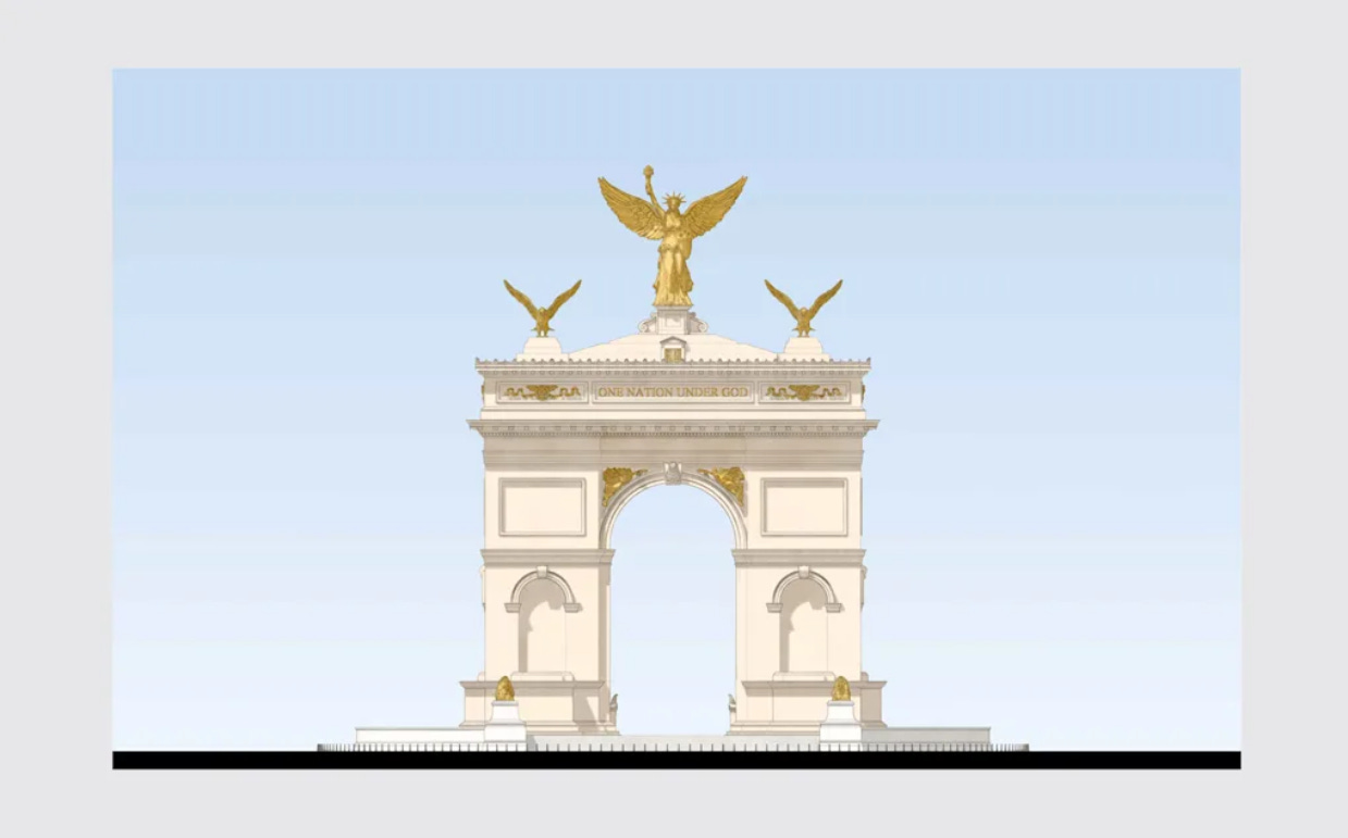 The height of the arch is a hat tip to the semiquincentennial anniversary of the nation’s founding, which will be celebrated in July. But like a skyscraper that adds a spire or antenna for a few extra feet, it gets there with some help from its ornamentation: a 60-foot winged Lady Liberty-like gold statue flanked by gold bald eagles. The rendering also shows gilded lions at the base and the phrases “ONE NATION UNDER GOD” and “LIBERTY AND JUSTICE FOR ALL” inscribed on either side.
