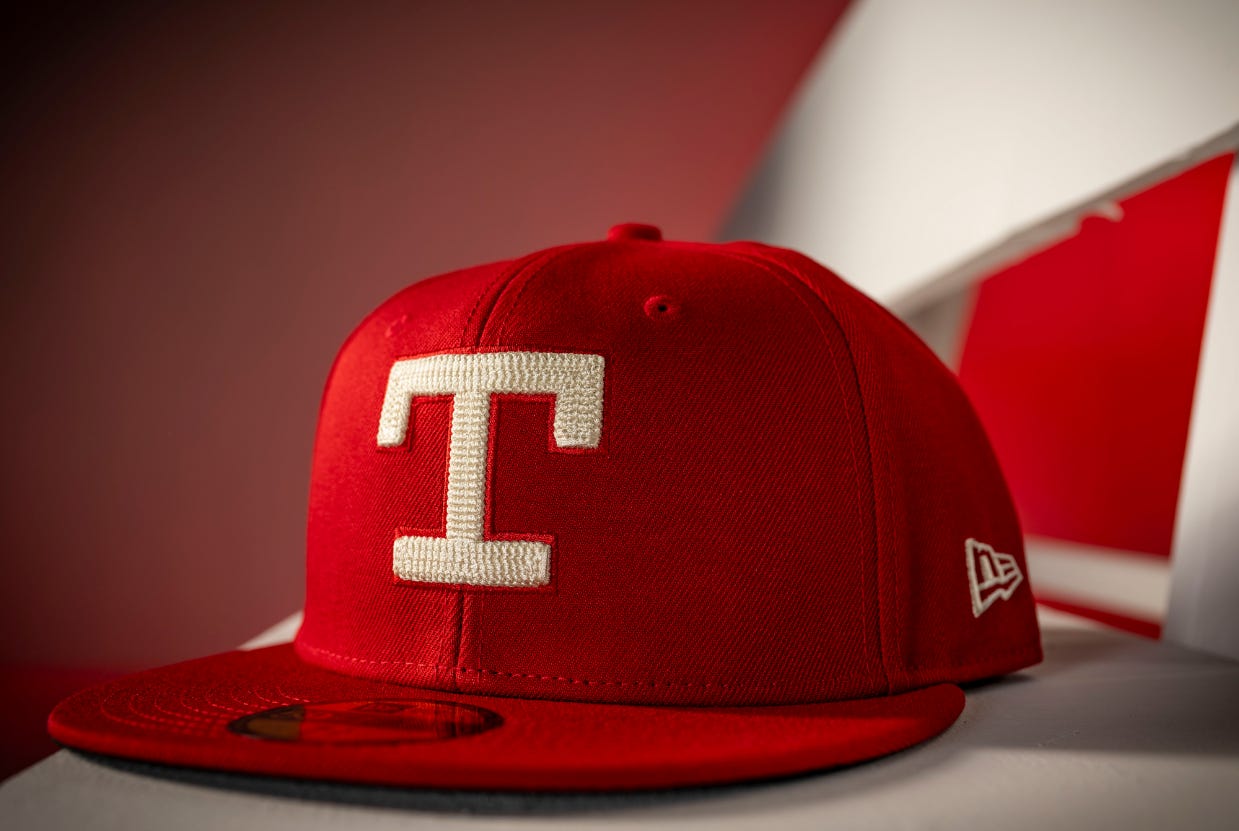 The blocky, athletic-style typeface on the jersey was designed as an update on the team’s 1980s uniforms typography, while the T on the ball caps is from the team’s original uniforms after relocating to Texas in 1972.