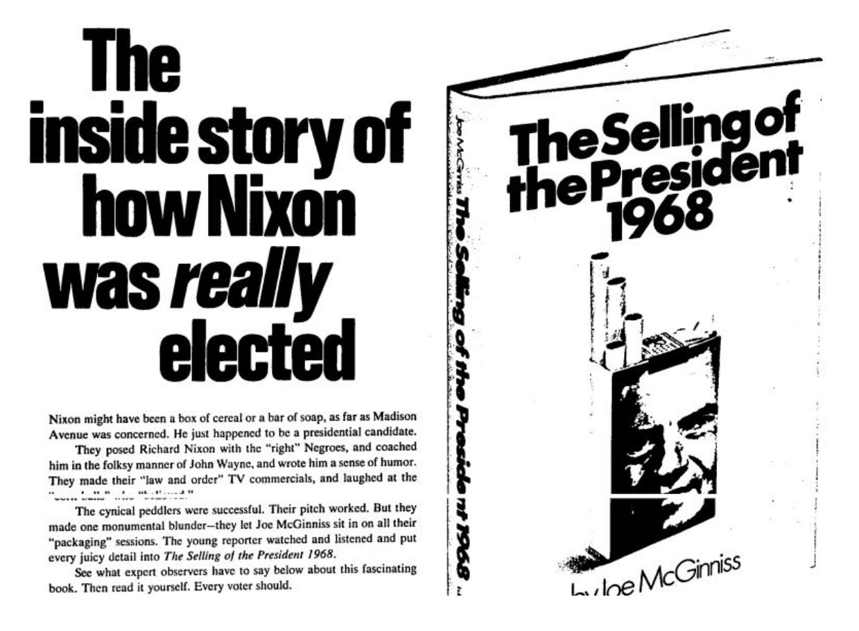 The year before McGinniss was born, his dad published his first book, The Selling of the President 1968, about the image-making machine behind Richard Nixon’s comeback campaign to win the presidency. The book introduced readers to figures like Roger Ailes, Nixon’s campaign media advisor who would go on to become the CEO of Fox News, and it popularized for the first time the idea that consumer television advertising methods were being applied to a presidential campaign. The book was groundbreaking and popular, spending 31 weeks on the New York Times bestseller list, and it made its author a star.