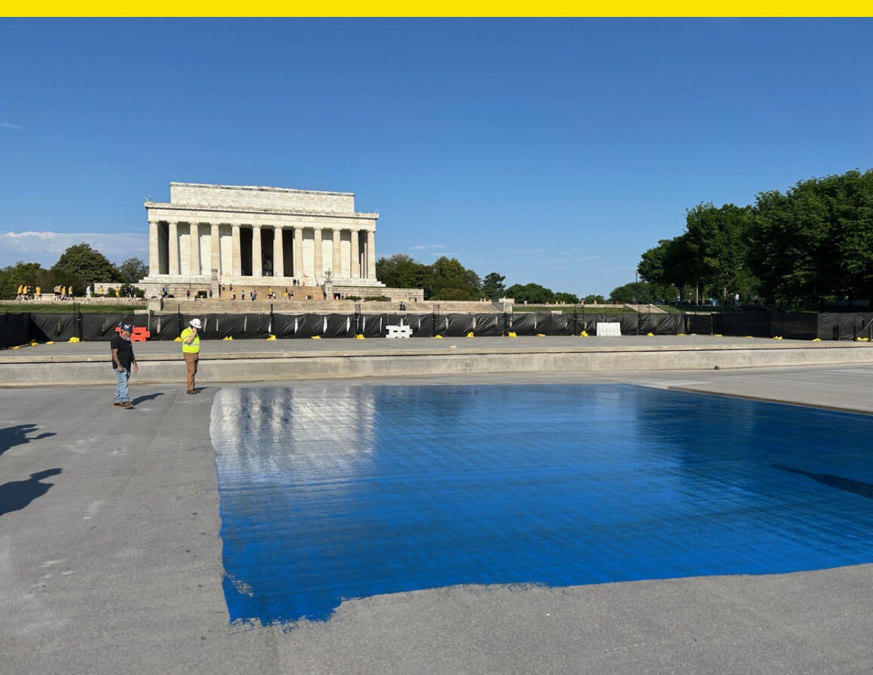 The Mar-a-Lagoification of our nation’s capital continues apace. After the foiled shooting Saturday at the White House Correspondents’ Dinner, Trump and his allies said that was further reason to build his ballroom, while on Friday, Trump posted photos on his social network showing the Lincoln Memorial Reflecting Pool getting refurbished with a new coat in a different color. For now, the memorial looks more like a municipal swimming pool