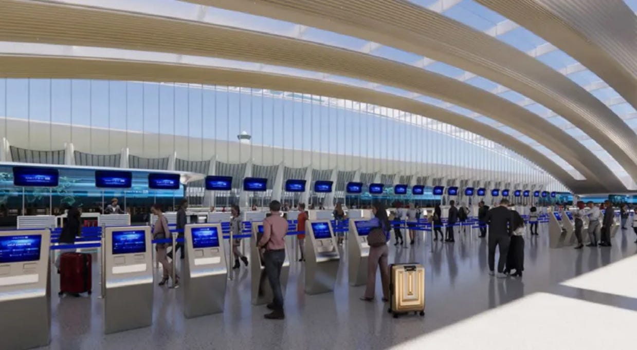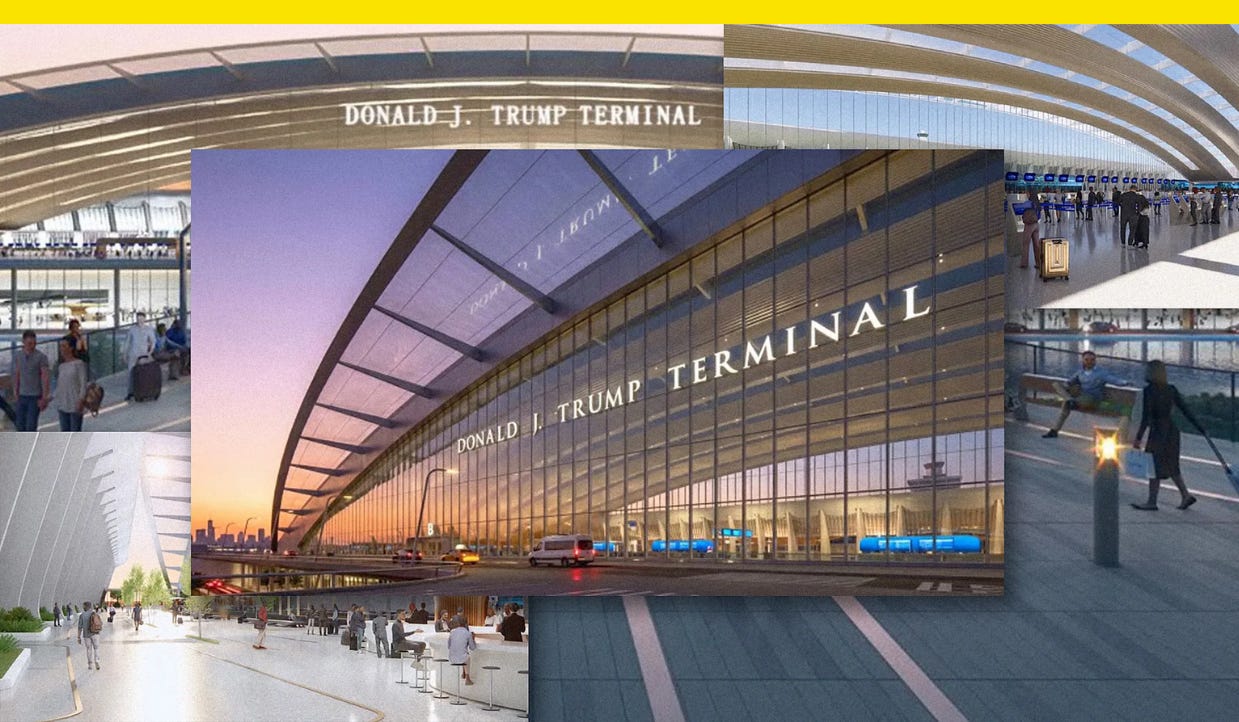 Renderings show the Trump terminal superimposed over the airport’s iconic existing terminal, completed in 1962 with a swooping concave roof and large window sides designed by architect Eero Saarinen. A departures hall in the proposed new building builds on Saarinen’s use of openness and natural light with a continuous skylight over a long-span roof.