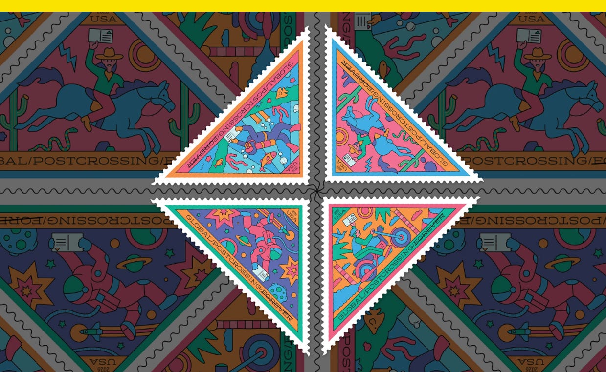 The triangle Postcrossing stamp from the U.S. Postal Service commemorates an international pen pal project started in 2005 by Paulo Magalhães, a student in Portugal. The program connects people around the world in a simple but increasingly old-fashioned way: Send a postcard, get one back.