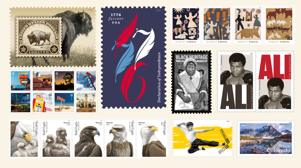 Other forthcoming stamps timed for next year’s anniversary that USPS announced include a “1776” stamp commemorating the signing of the Declaration of Independence with artwork by Juan Carlos Pagan, a pane of bald eagle stamps illustrated by ornithologist David Allen Sibley, and “American Bison.”