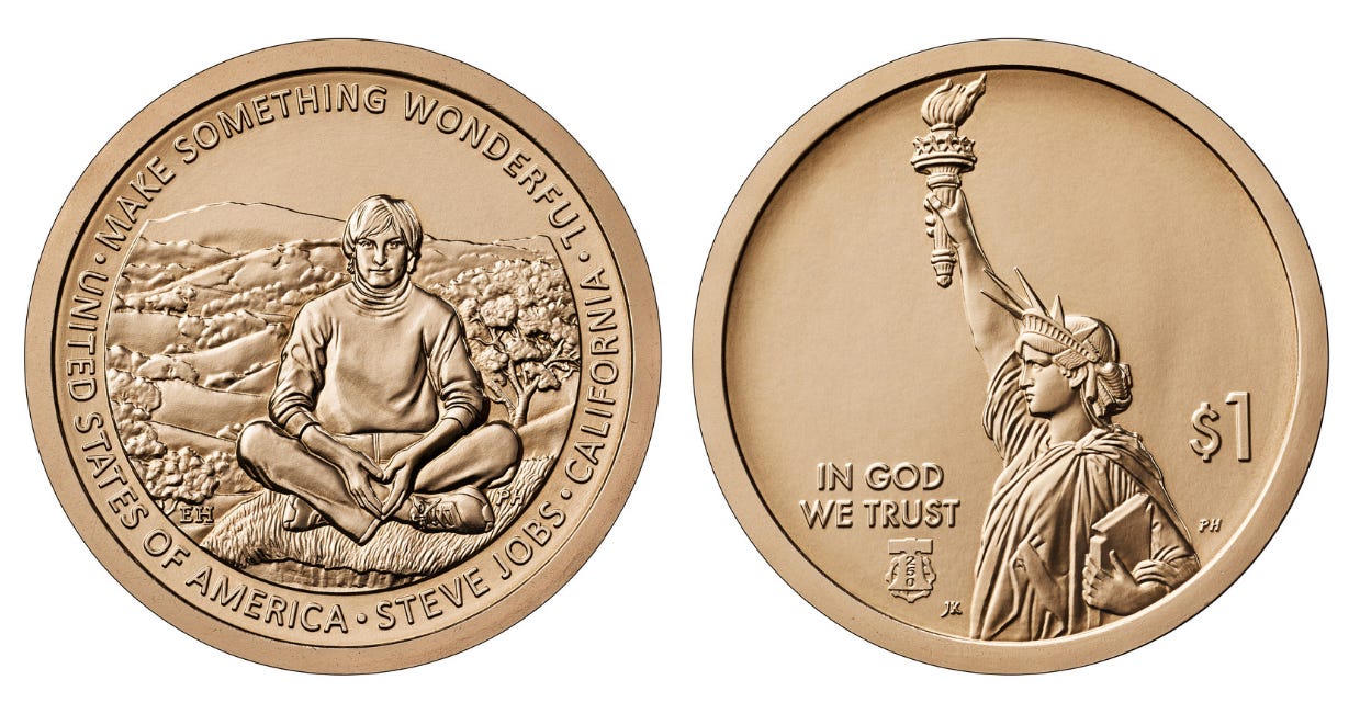 The coin, designed by designer Elana Hagler and sculpted by medallic artist Phebe Hemphill, shows Jobs sitting cross-legged in front of an idyllic Northern California landscape with the phrase “Make Something Wonderful.” The reverse side shows the Statue of Liberty.