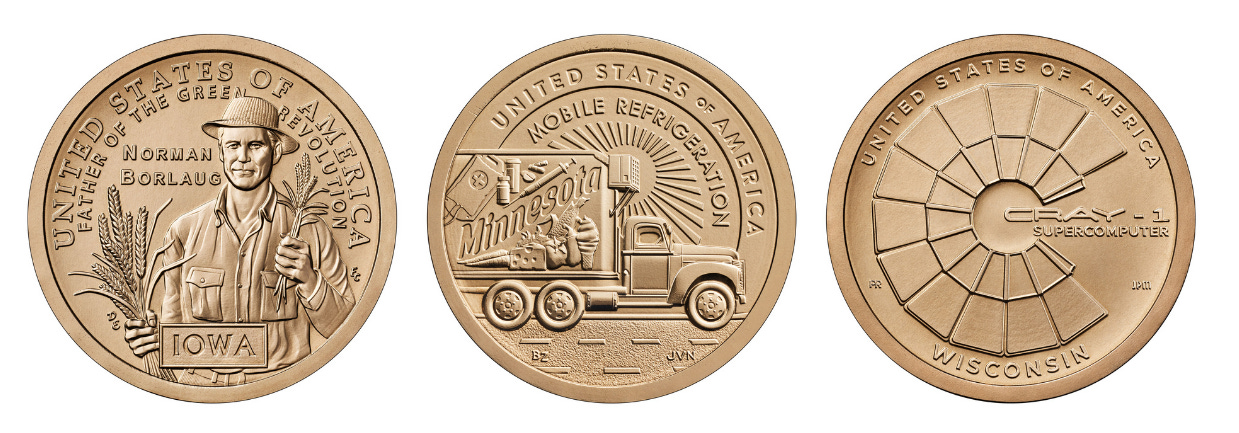 The Mint says it works with governors’ offices to determine design concepts that are “emblematic of innovation” for the coin program, and not all of them will be people. Other coins the agency released designs for include Iowa, which shows agriculturist and “Father of the Green Revolution” Norman Borlaug, who won a Nobel Peace Prize for his work to feed the hungry; Minnesota, which shows a frozen food truck to honor mobile refrigeration; and Wisconsin, which shows a top-down view of the Cray-1, a 1970s supercomputer.