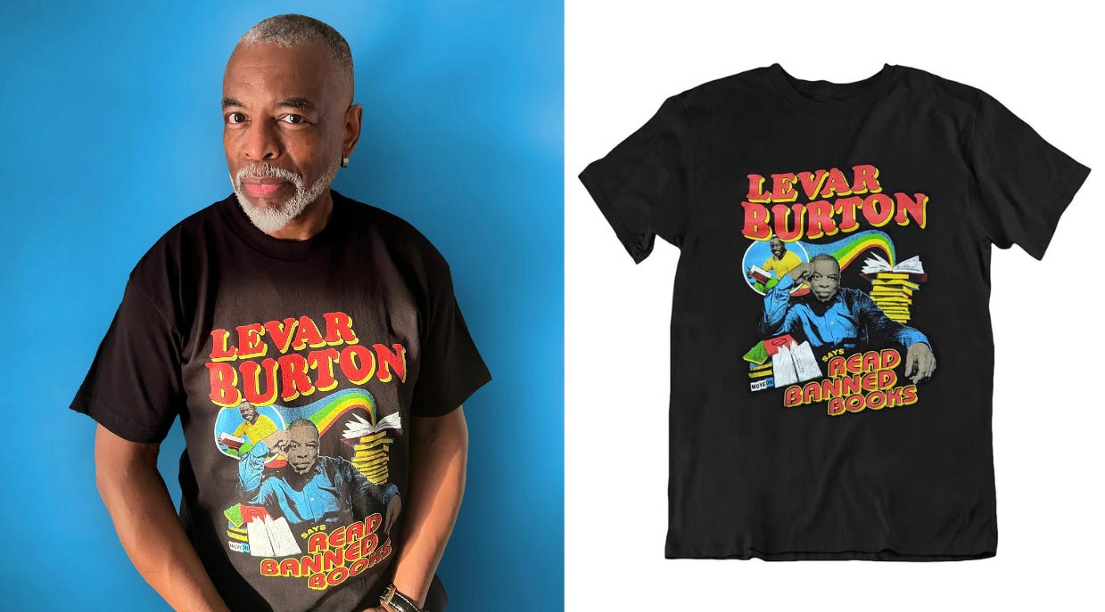 LaVar Burton is raising money to fight book bans. To mark National Banned Book Week this week, the former host of PBS’ “Reading Rainbow” partnered with MoveOn for a limited-edition “LeVar Burton Says Read Banned Books” t-shirt to fund the group’s Banned Bookmobile and other efforts to combat book bans. “I'm concerned for teachers and librarians who feel they can't do the job they love,” Burton said in a statement. “I’m honored to help inspire people of all ages to speak out against this dangerous form of censorship during Banned Books Week and all year around.” [MoveOn]