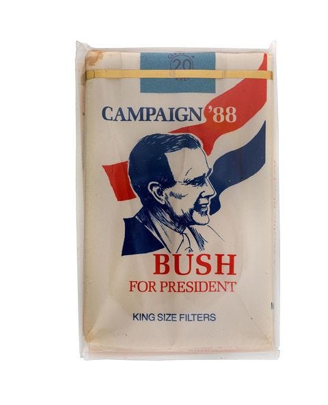 George H.W. Bush cigarettes (1988). Beginning in the 1950s, novelty candidate-branded cigarettes allowed smokers to show who they were voting for, but the practice fizzled out following the 1988 campaign, according to the Smithsonian National Museum of American History. 🚬
