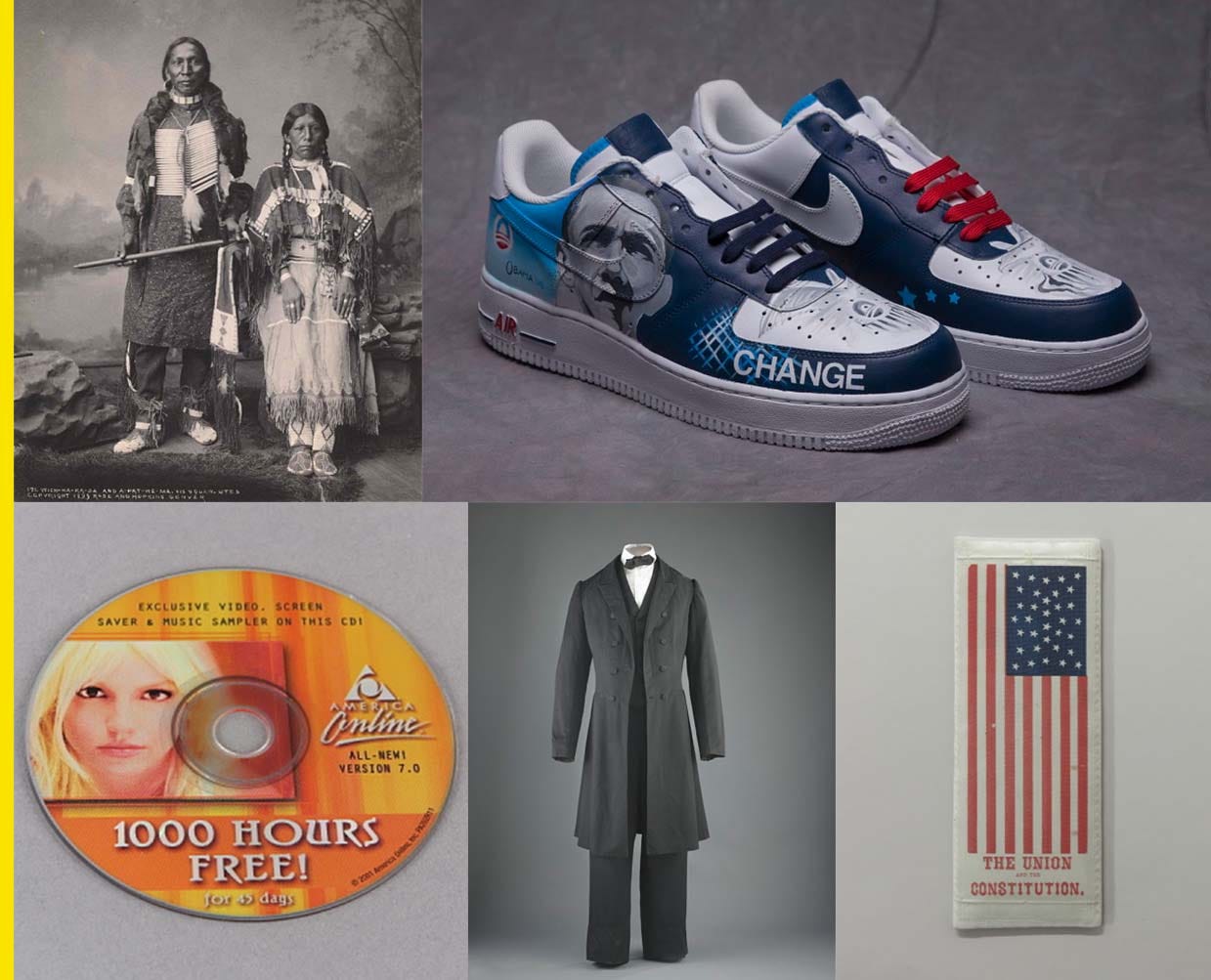 From top left to bottom right: Photograph of Wich-Ha-Ka-Sa and A-Pat-We-Ma, a Ute couple, in 1899; custom painted Nike Air Force 1s with an image of Barack Obama by artist Van Taylor Monroe III in 2008; promotional disc for America Online, Inc., with an image of Britney Spears from 2001; Abraham Lincoln’s office suit; a vintage campaign ribbon.