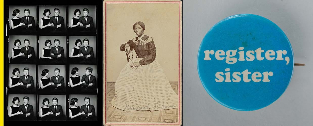 From left to right: contact sheet of John F. Kennedy and Jacqueline Kennedy from 1961; portrait of Harriet Tubman in 1868 or 1869; a voter registration button from the 1970s.
