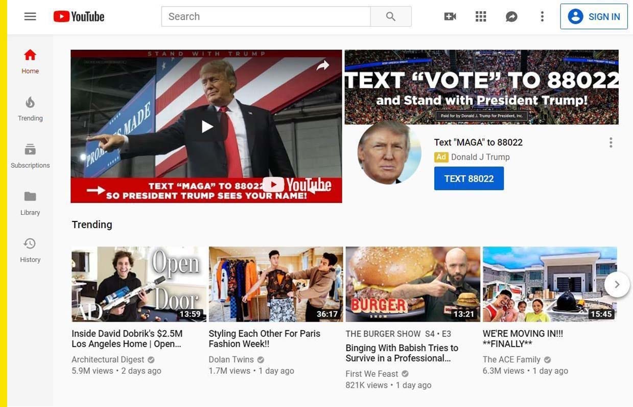 The YouTube homepage will be decked out in Trump come Election Day. The campaign purchased ad space on YouTube’s “masthead,” or the video ad spot on top of its homepage, for early November, according to Bloomberg. We don’t know how long the ads will run or how much the campaign paid, but the space is estimated to cost anywhere from hundreds of thousands of dollars to more than $1 million a day.
