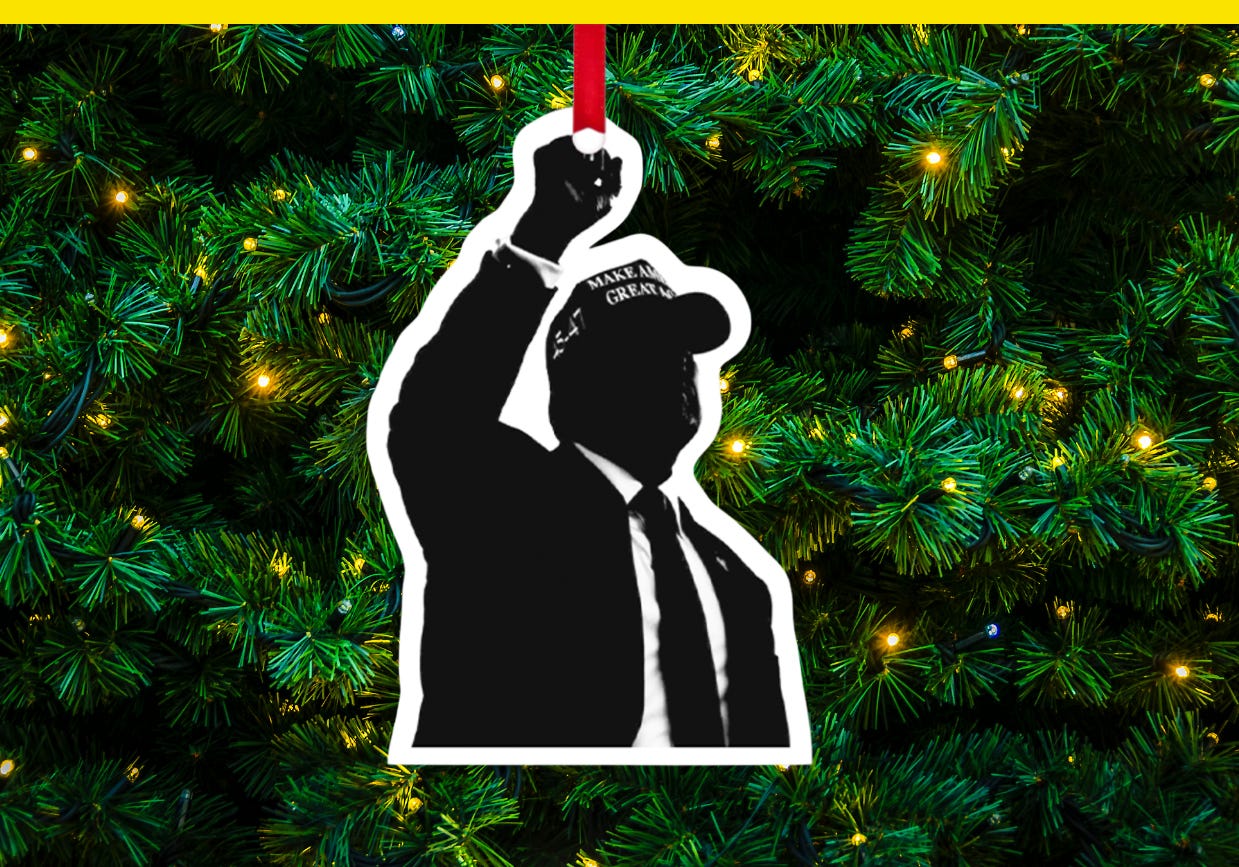 Tees, hoodies, and sweatshirts that range from $25 to $50 picture Trump in a Santa hat or write out “Make America Great Again” in knit-style type for an ugly Christmas sweater look. The $35 official Trump 2026 calendar was made for 13 months and a $32 ornament of Trump’s silhouette with his fist raised is labeled the “MAGA Fist Christmas Ornament.”