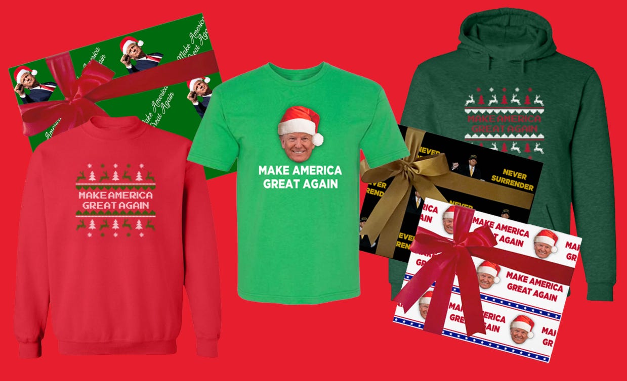 The first email promoting the campaign’s latest Christmas merch came Nov. 6, for $15 “MAGA green wrapping paper.” And ever since, in between emails like one asking supporters whether they would “accept a tariff rebate check signed by Trump,” or another attacking New York Mayor-elect Zohran Mamdani as a communist (“A communist was just elected in NYC, and you STILL haven’t joined my Anti-Communist Club?!” the email signed by Trump read), his mailing list has also promoted the 2026 MAGA Christmas line.