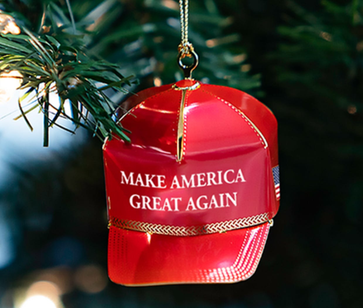 The campaign’s shop offers three Trump-themed wrapping paper designs, including one in black that says “Never Surrender,” a $40 Merry Christmas edition “Make America Great Again Hat” with embroidered Christmas trees and Christmas lights, and a $40 red MAGA hat ornament.