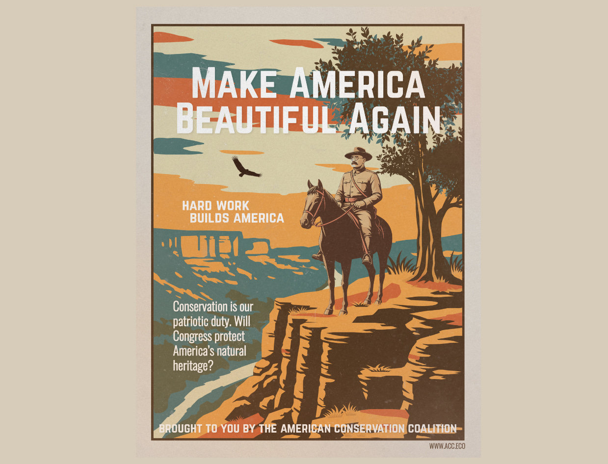 The artwork for the banner was created by ACC creative director Lucero Cantu. She purposefully drew inspiration from the 1930s National Park Poster series commissioned by the Works Progress Administration during another Roosevelt’s presidency, Democrat FDR. Text on the poster reads “Hard Work Builds America” and “Conservation is our patriotic duty. Will Congress protect America’s natural heritage?” Cantu has designed other similarly styled posters picturing conservatism for a conservative audience.