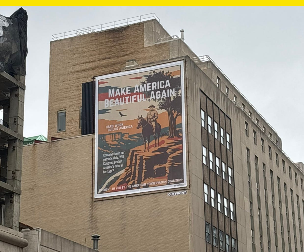 A new banner of Teddy Roosevelt with the message to “Make America Beautiful Again” is now up in Washington, D.C., at the corner of H and 11th Streets. It’s not one of the federal government’s growing number of banners, but commissioned by the American Conservation Coalition, or ACC, a conservative conservation group.