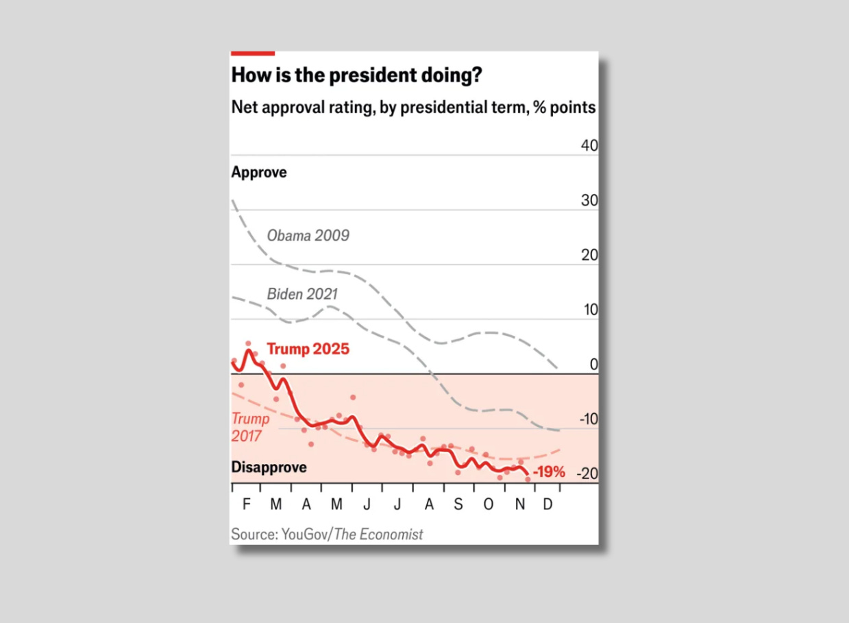 Though Trump won in 2024 by a slim 49.91% plurality of the popular vote, he has before claimed to have won “a historic mandate to make America great again.” Polling now a year on, though, shows whatever slim popular mandate Trump once claimed to have has since evaporated. In just over a year, the U.S. has taken a U-turn on Trump.