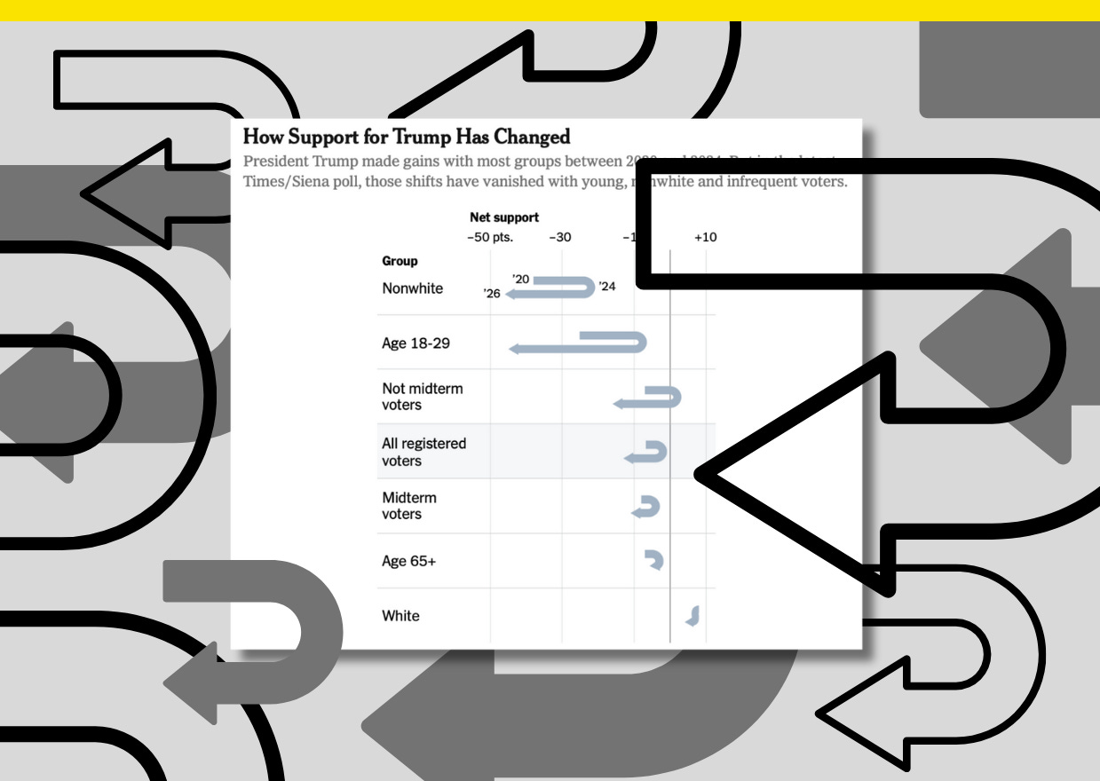 To illustrate that story for a column about the poll’s findings by the Times’s chief political analyst Nate Cohn, the paper reimagined a typical approval rating line over time into a U-shape that shows net support for Trump rising and falling.