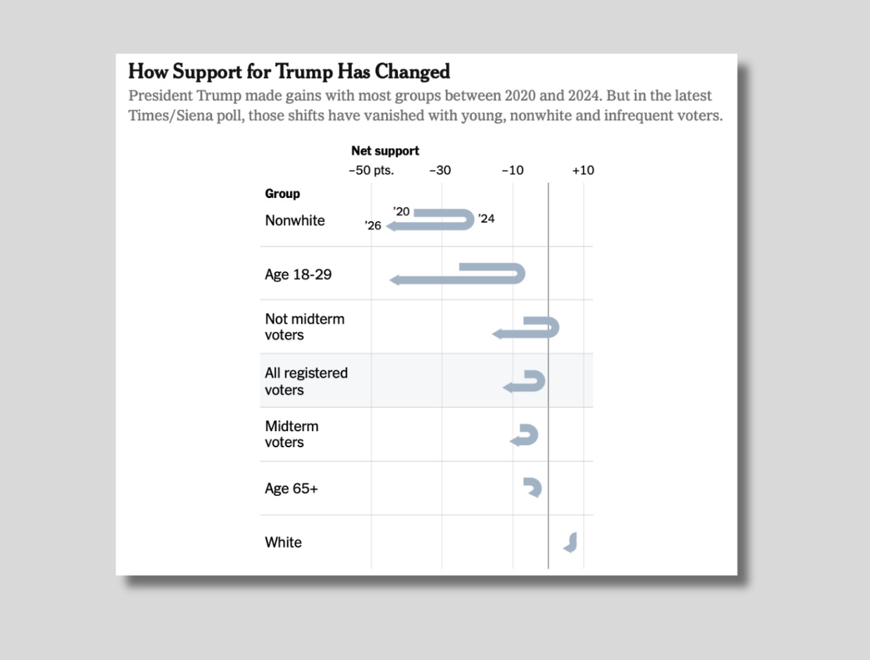 Fantastic breakdown. The U-shaped chart format is such smart visual storytelling, way more impactful than another line graph declining over time. What really struck me is how approval fell below 2020 levels across those younger and nonwhite voter groups who wer key to flipping the election.