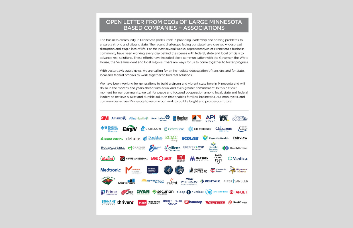 In a letter from the Minnesota Chamber of Commerce on behalf of more than 60 CEOs on Minnesota-based companies, the chamber said it was “calling for an immediate deescalation of tensions” and asked for state, local and federal officials to find “real solutions.” The group said it has “been working every day behind the scenes with federal, state and local officials” for “the past several weeks.”