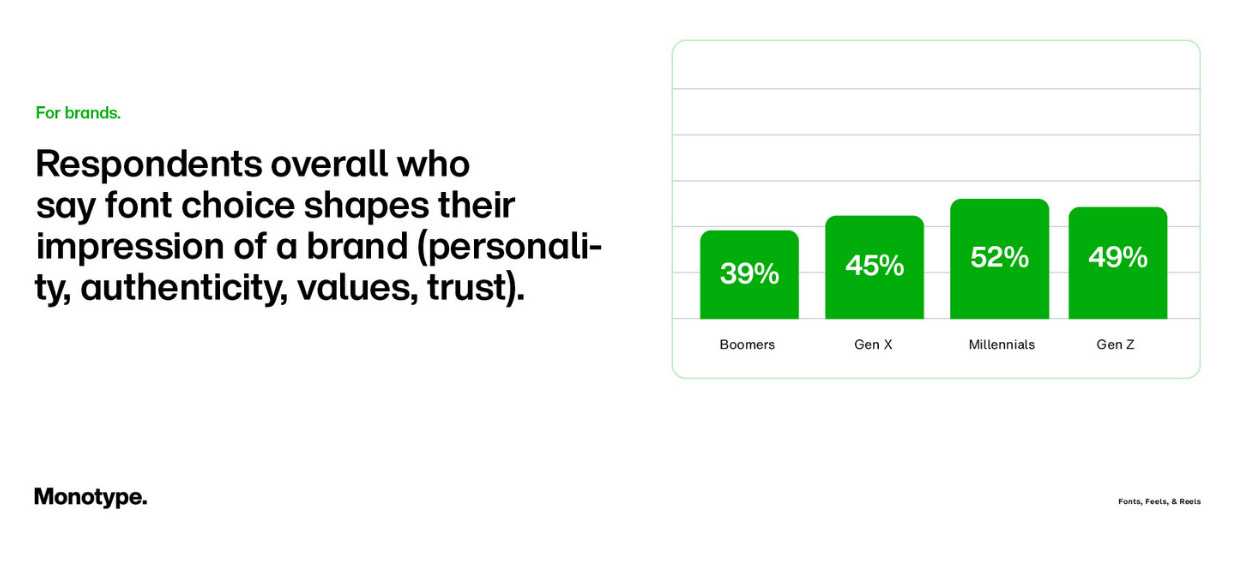 “Fonts, Feels, & Reels: Generational Attitudes to Type” found that while just 39% of Baby Boomers say font choice shapes their impression of a brand, that figure is higher for Gen X (45%), Gen Z (49%), and most of all Millennials (52%).