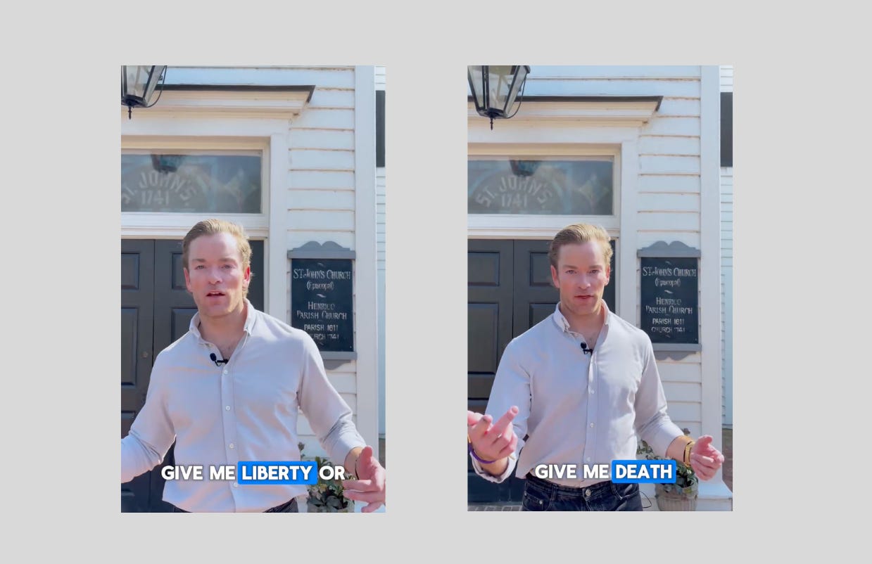 Shot outside St. John's Church in Richmond where Patrick Henry gave his most famous speech, Moran introduced himself with a walk-and-talk-style video popularized by New York City Mayor Zohran Mamdani’s mayoral campaign. With a mic on his collar and pep in his step, Moran talks in the cadence of a frat leader with gestures that look like a white dude trying to rap. Swinging his arm around to deliver Henry’s famous phrase, “Give me liberty or give me death,” Moran adds, “My name’s Mark Moran. 250 years later, I’m saying the same thing.”